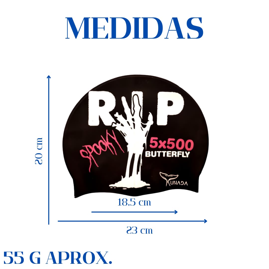 ¡Halloween llega a la alberca con humor y terror! La gorra de natación RIP muestra una mano emergiendo de la alberca con el mensaje “SPOOKY 5×500 BUTTERFLY”, un guiño divertido a todos los nadadores que saben que un 5×500 mariposa puede sentirse como la muerte. Fabricada en silicón de alta calidad, protege tu cabello, reduce la fricción y se ajusta cómodamente para entrenamientos y competencias. Perfecta para nadadores que quieren un diseño original y lleno de personalidad esta temporada.