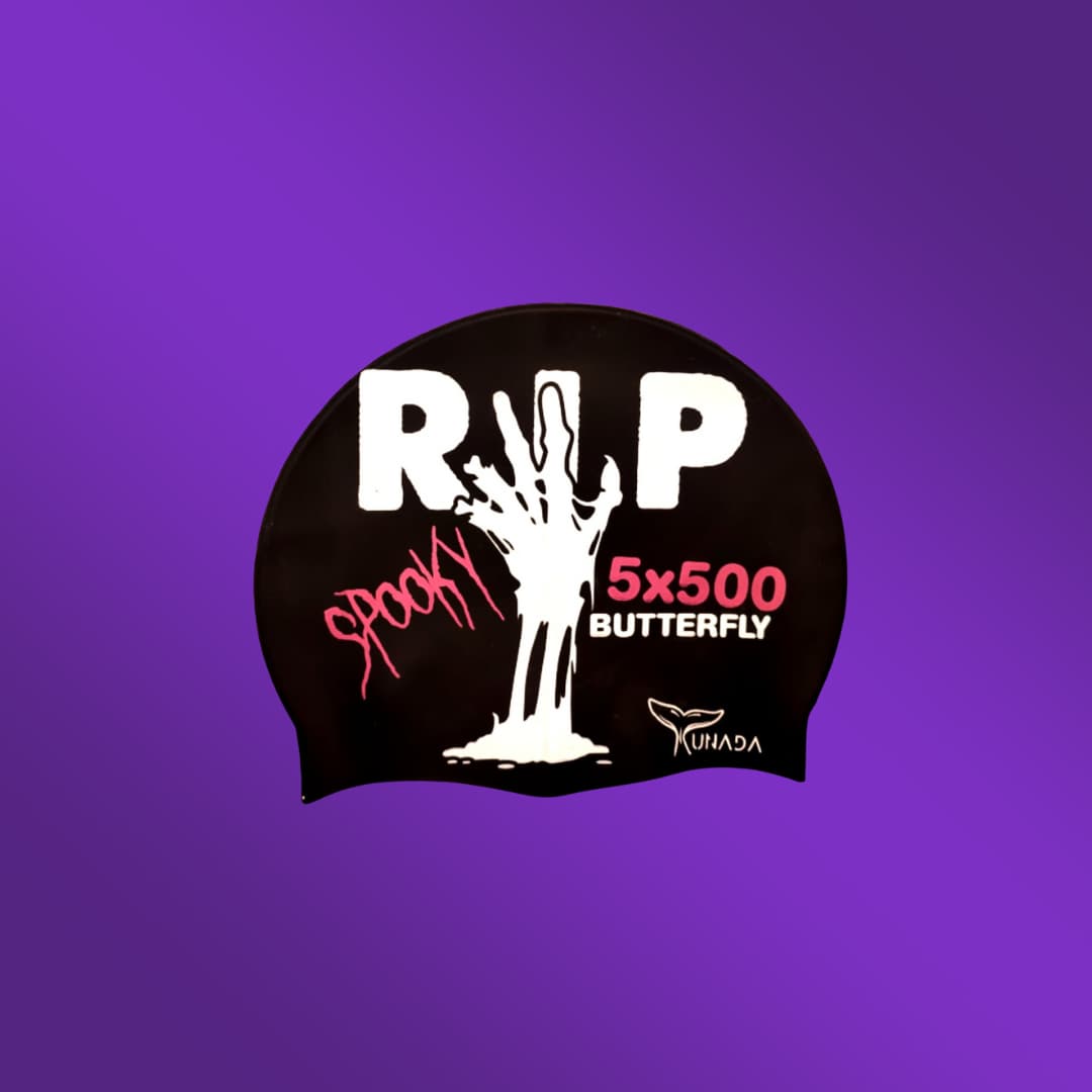 Cuando el 5×500 mariposa parece la muerte… RIP 🏊♂️💀. La gorra RIP es diversión y terror para nadadores en Halloween.